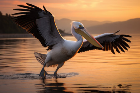 Dalmatian pelican (Pelecanus crispus) shot at sunrise at lake Kerkini in Greece