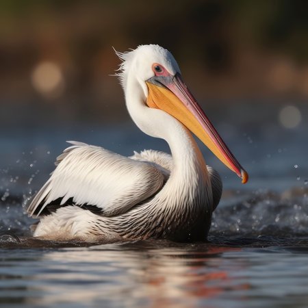 A pelican stands gracefully near the water, showcasing its long beak and colorful feathers against a shimmering backdrop.