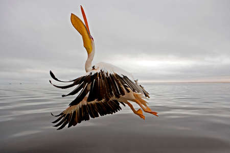 Great White Pelican, pelecanus onocrotalus, Adult in Flight near Walvis Bay in Namibia