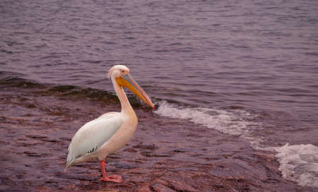 Beautiful pink pelican bird. Natural wildlife shot in Namibia. Pelican with ocean sea background. Wild animal in nature. Close up of nature