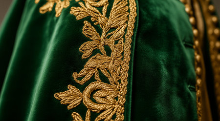Intricate gold embroidery on luxurious green velvet fabric. That the image is generated using AI.