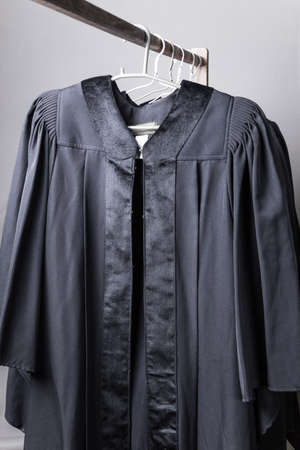 Black graduation gowns hanging on cloth hangers on wooden rail