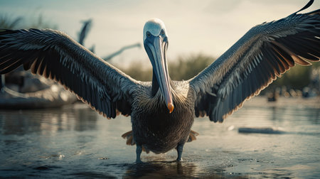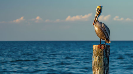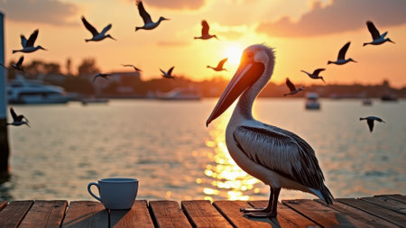 pelican enjoying a tropical sunset, with photorealistic details and attention to fur and feathers texture. the dark sky-blue and light brown colors create a stunning coastal and harbor view. this 32k uhd image showcases the bird in a relaxed state, with focus stacking and photorealistic rendering adding depth to the scene. ai generated