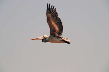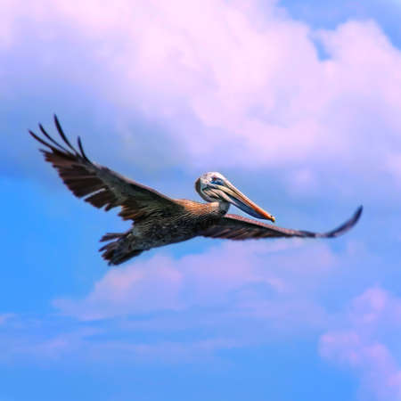 Pelican flying in the sunny sky of the Dominican Republic in Punta Cana
