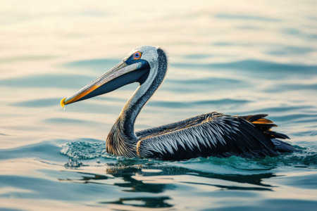 A stunning close-up of a brown pelican gracefully swimming in calm shallow waters, showcasing its vibrant feathers and majestic reflection against the serene ocean backdrop.