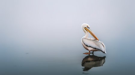 A white pelican with black wingtips lands gently on the surface of a calm, misty lake, creating a small spray of water as its feet touch the water. The pelican's wings are outstretched, its long beak is open slightly, and its eyes are focused on the water ahead.