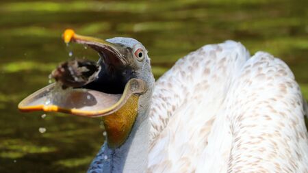 Pelican catching fish. Photo from animal live. Bird on the water.
