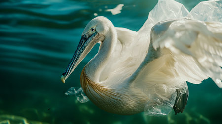 A poignant image of a bird struggling in plastic waste, showcasing the urgent need for environmental awareness and conservation efforts to protect wildlife.