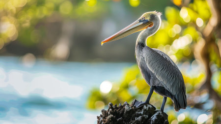 a pelican perches gracefully on a branch, captured in a photorealistic style. the light red and beige tones enhance the backlit photography, while vray tracing and photo-realistic techniques bring out the intricate details. the composition is further enhanced by the contrasting light orange and blue hues. this stunning image is available under the creative commons attribution license. ai generated