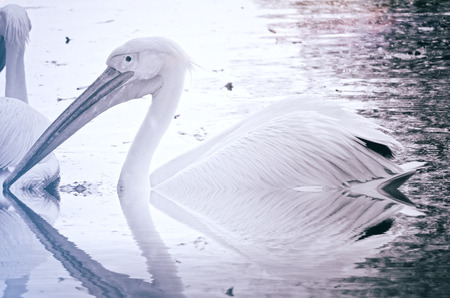 Wild african birds. One large pink pelican and its reflection in the clear water of the lagoon