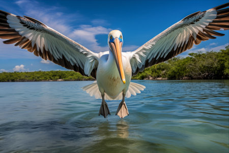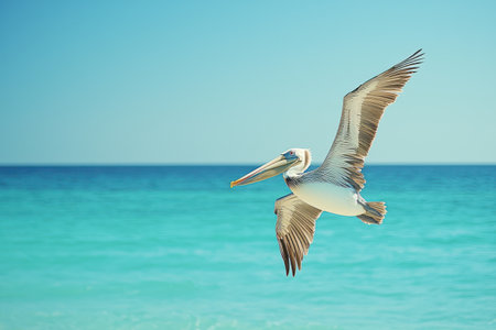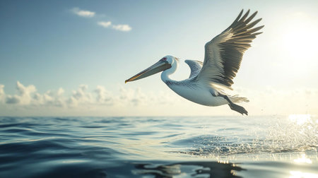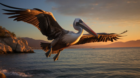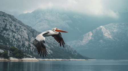 A majestic pelican soaring over a serene body of water. Generative AI