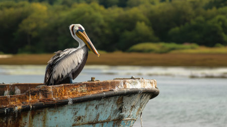 A pelican stands gracefully on a rusted boat that floats in tranquil waters. Lush green trees frame the background, reflecting the calm of a peaceful afternoon