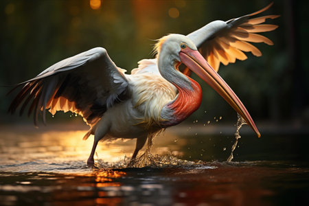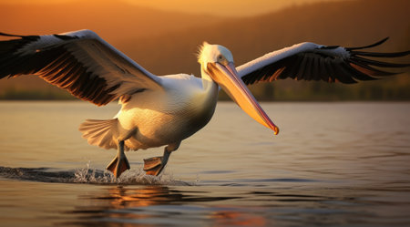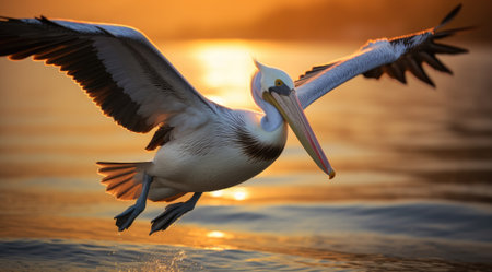 Serene sunset over lake with pelican and birds silhouetted in the golden glow. That the image is generated using AI.