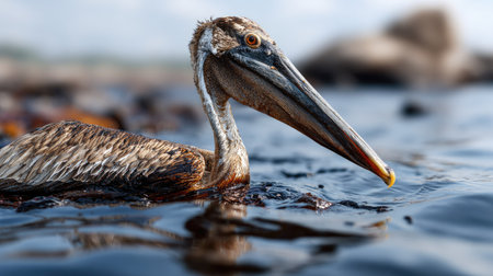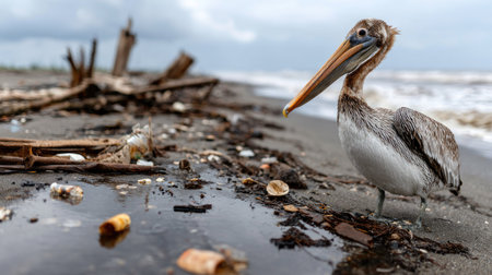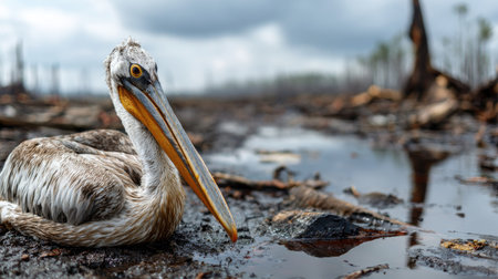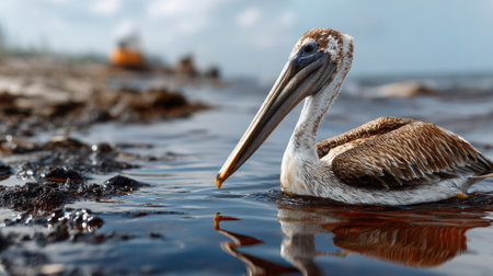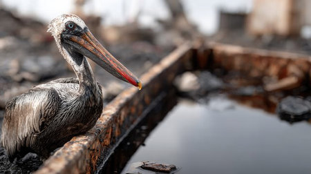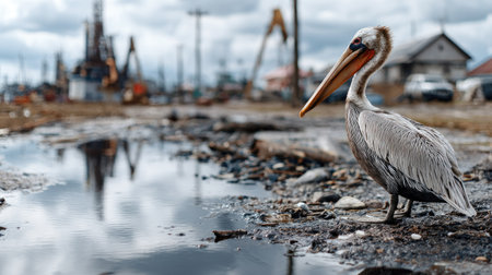 A pelican stands near oil-contaminated water, emphasizing the devastating effects of pollution on wildlife and the urgent need for environmental conservation efforts.