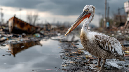 A pelican stands in a polluted urban environment surrounded by debris and murky water, showcasing the stark contrast between wildlife and urban waste.