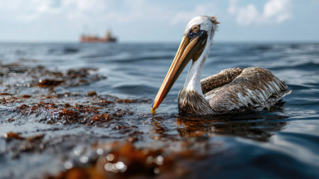 A lone pelican floats on the surface of a polluted ocean, highlighting the impact of oil spills on marine wildlife, with a ship in the distance under dramatic skies.