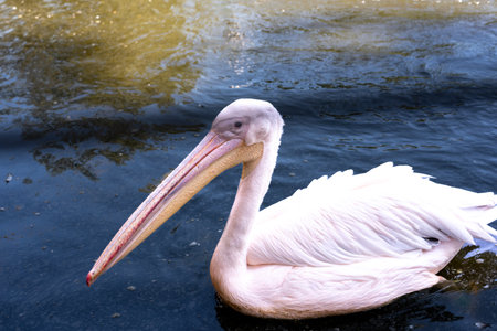 Enchanting Moments: The Elegant Dalmatian Pelican Adorning the Dark Lake in the Park