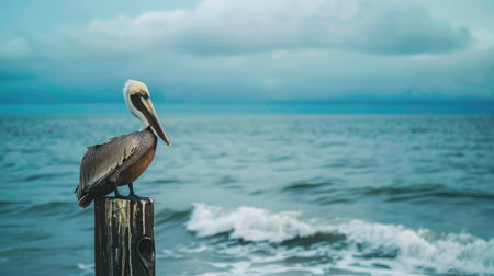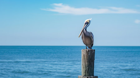 Pelican perching on wood, beak in focus, overlooking tranquil sea generated by artificial intelligence