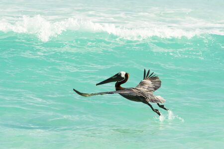 Flying Brown Pelican on a sunny day looking for fish to eat. Cancun, Mexico.