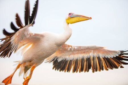 Pelican flying in the sky over Lake Garda, Italy