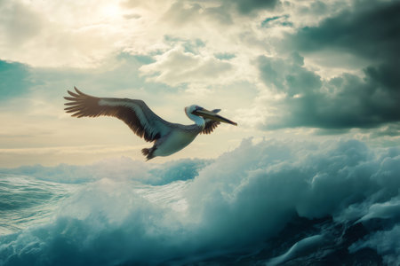 Brown pelican soaring gracefully over turbulent ocean waves, searching intently for its next meal amidst the stormy seascape
