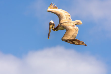 A Soaring brown pelican over Gulf of Mexico with clear blue skies