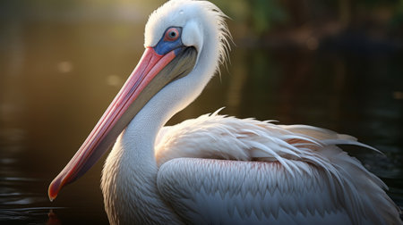 a pelican swimming gracefully in the water, captured in a close-up, eerily realistic portrait. this stunning image showcases the exquisite details of the pelican's light white and pink feathers. rendered in cinema4d and brought to life with unreal engine, this artwork beautifully captures the exotic beauty of these magnificent birds. ai generated