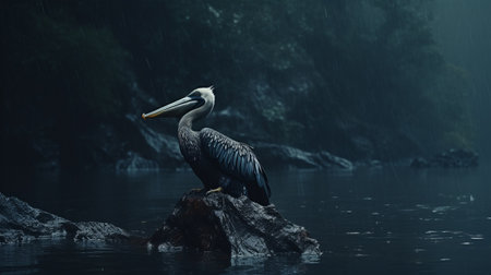a felt stop-motion pelican stands on a cliff in the rain, amidst a south african forest storm. the 4k image captures the shallow depth of field, with the dark navy forest serving as a backdrop. the scene is enhanced by hints of chiffon and a touch of blue, creating a low saturation effect in the night. ai generated