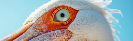 A close-up view showcases the striking features of a pelican's face against a clear blue sky. The vivid colors and intricate textures highlight its unique beauty and alert expression.