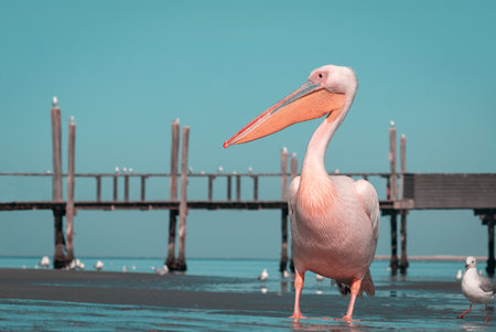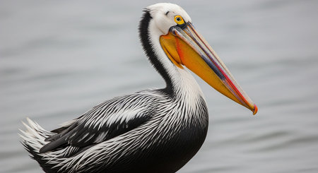 pelican bird captured in vibrant colors of dark orange and light blue. the bird's well-nourished physique and striking beak are highlighted by dramatic shadows. shot with a voigtlander heliar 15mm f45 lens, this 32k uhd photo exudes a street photography vibe. the elaborate color scheme and attention to detail make this wildlife photo a stunning addition to any collection. ai generated