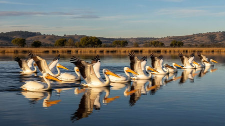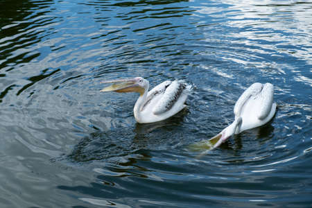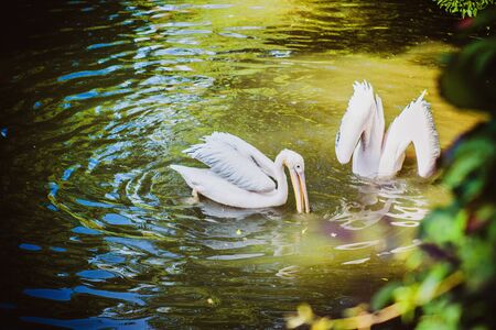 Flock of white pelicans floating on water in the middle of the lake, beautiful quiet water with sun reflections