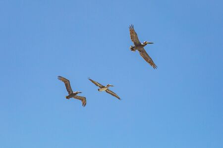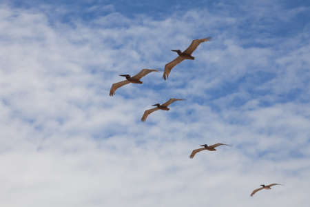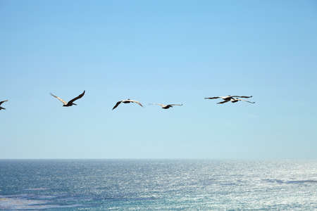 Formation of pelicans flying for food on Mexico