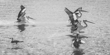 Pelicans taking off for flight seen in Coquimbo, Chile