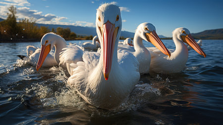 A group of pelicans swimming in a lake with their beaks out, AI