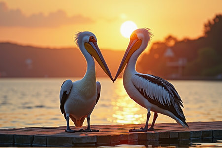 Two pelicans facing each other at sunset on a lake dock. That the image is generated using AI.