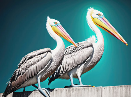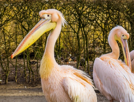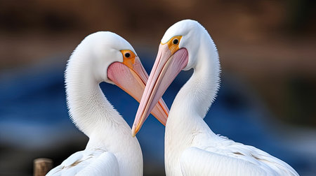 Two graceful white pelicans. Twins. Close profile view