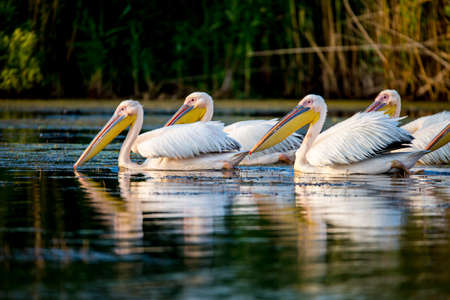 Flock of Dalmatian pelicans (Pelecanus crispus) swimming in the lake