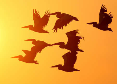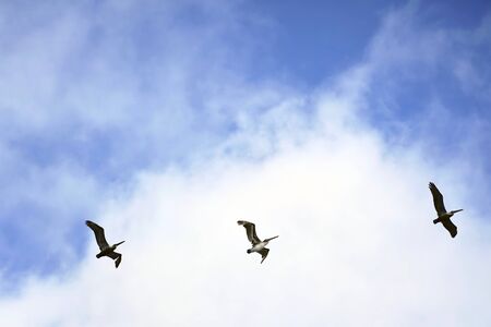 Beautiful Pelicans in flight against bright sky panoramic view