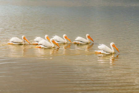 A flock of white pelicans swimming in the lake at sunset.