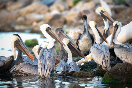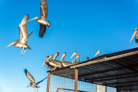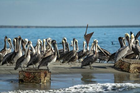 Pelican colony many birds in baja california on the sky background