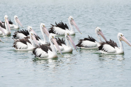 A group of Australian pelicans swimming in a tight group together.