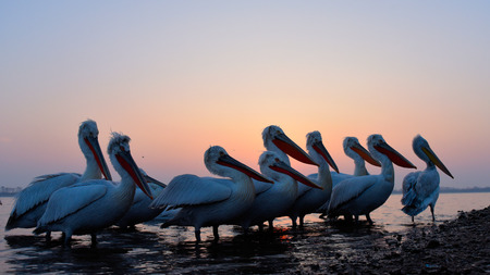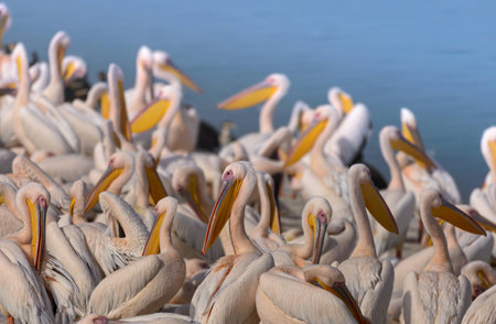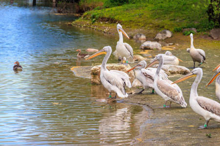 Flock of Dalmatian pelicans (Pelecanus crispus) on the lakeshore