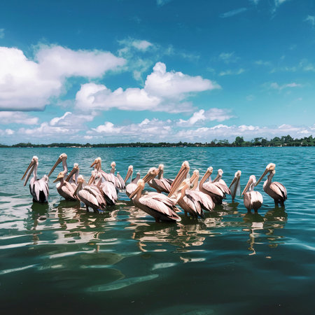 Pelicans in the water on a sunny day