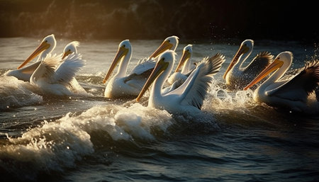 A flock of pelicans diving into the ocean to catch fish, their synchronized movements creating splashes in the water.