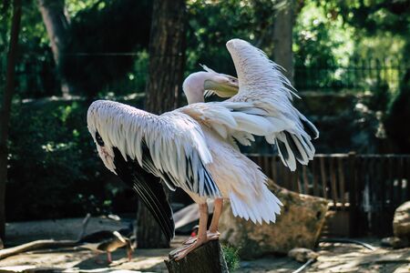 View of a great white pelican also known as the eastern white pelican, a bird in the pelican family. It breeds from southeastern Europe through Asia and Africa, in swamps and shallow lakes