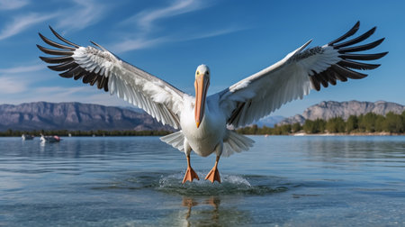 Bird landing to the blue lake water. Bird fly. Dalmatian pelican, Pelecanus crispus. Generative AI