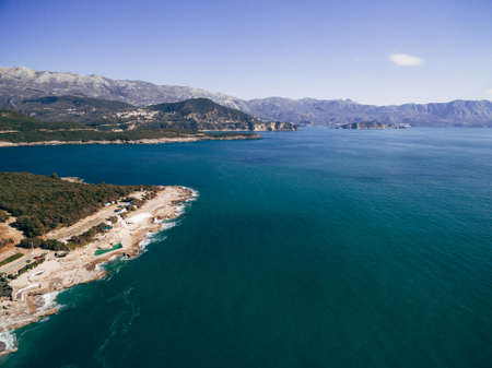 Rocky coastline on the Lustica peninsula overlooking Mount Lovcen in Montenegro. Aerial top view.