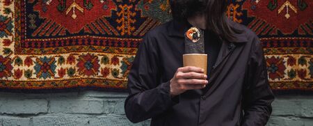 Shawarma doner roll in black pita in man hands.