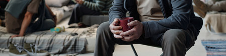 Header of senior man holding mug while sitting in front of camera in crisis camp for homeless people