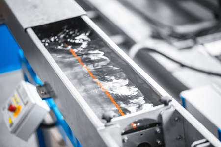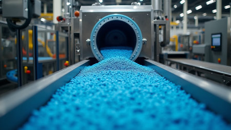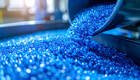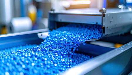 Futuristic production line with blue plastic pellets on conveyor belt